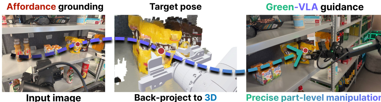 To handle novel objects specified in language, Green-VLA incorporates a Joint Prediction Module (JPM) that infers a 3D target point pp^*p in the robot’s workspace from the instruction and visual observation. This point is derived by first predicting a 2D affordance location via a vision-language model, then lifting it to 3D using camera intrinsics and pose: