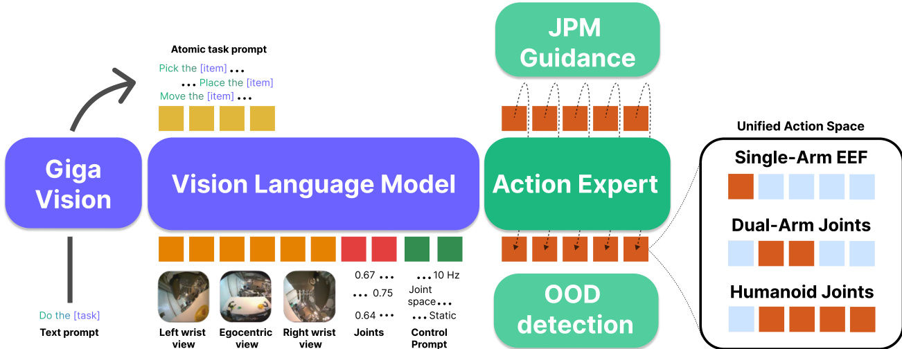 A key innovation is the integration of a high-level task planner based on GigaVision, which operates independently and remains frozen during training. This planner parses user instructions into atomic subtasks (e.g., “pick [item] with [left] hand”) and conditions Green-VLA via structured prompts. During execution, Green-VLA signals task completion via an episode-end probability; if this exceeds a threshold, the planner queries a feedback module to validate success or trigger replanning. Refer to the framework diagram for the full inference loop, which includes guidance and safety modules.