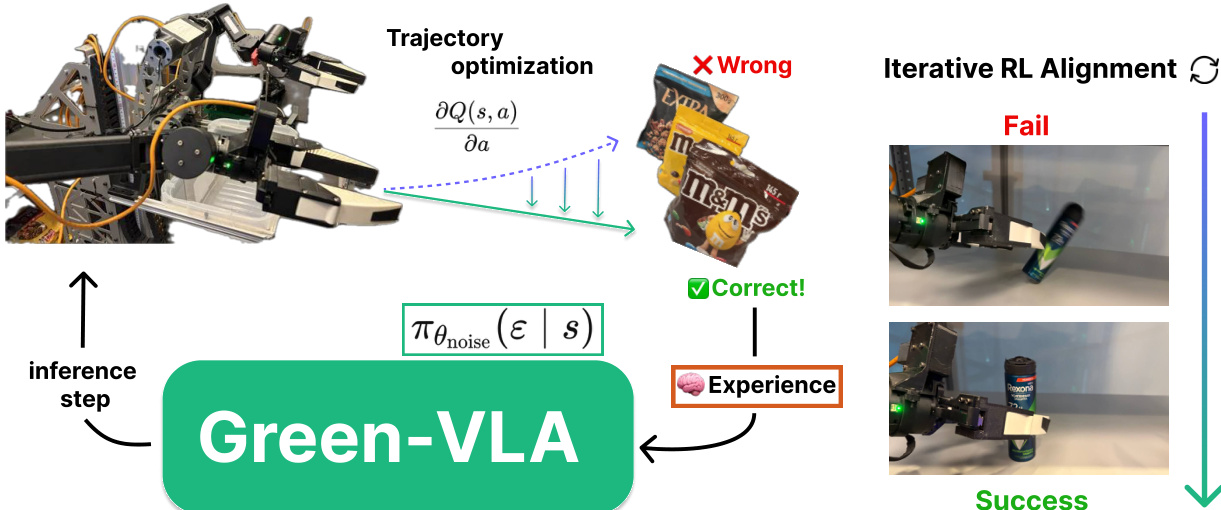 Sber Robotics Center’s Green-VLA introduces a staged Vision-Language-Action framework that unifies heterogeneous robot data via semantic action alignment, DATAQA filtering, and RL refinement, enabling zero-shot generalization to humanoids and manipulators while boosting long-horizon success through episode-progress prediction and joint-guidance modules.