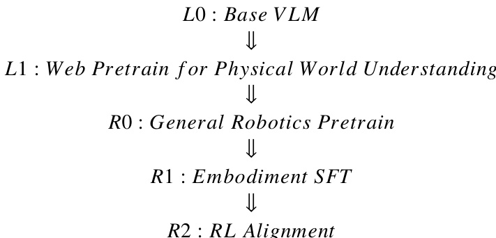 • L1 trains general visual-language priors; R0 trains embodiment-agnostic policies.