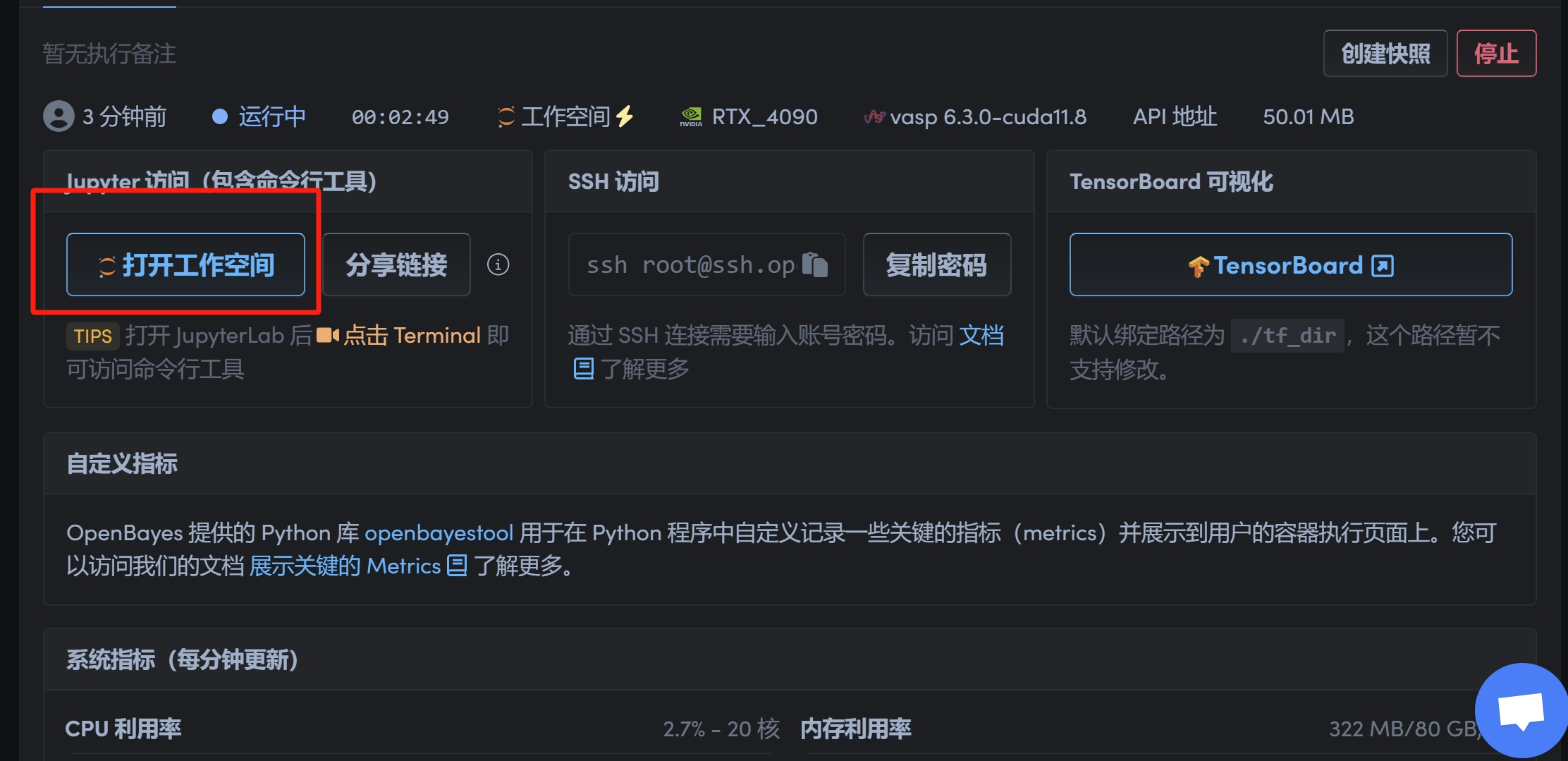 Next, we will move on to the practical part of the tutorial. The tutorial has prepared the required packages, and you can directly clone the container. This tutorial uses RTX 4090 computing resources, vasp 6.3.0-cuda11.8 version image, and operates in the workspace.