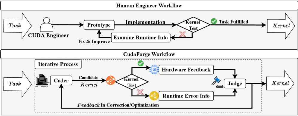 CudaForge is a trainingless multi-agent workflow for CUDA kernel generation and optimization, inspired by the iterative workflow of human experts. It includes steps such as developing an initial kernel, testing for correctness, analyzing hardware feedback, and iterative improvement. More specifically, CudaForge employs two LLM agents: a Coder and a Judge, which iteratively generate, correct, and optimize CUDA kernels while integrating hardware feedback, such as Nsight Compute (NCU) metrics.
